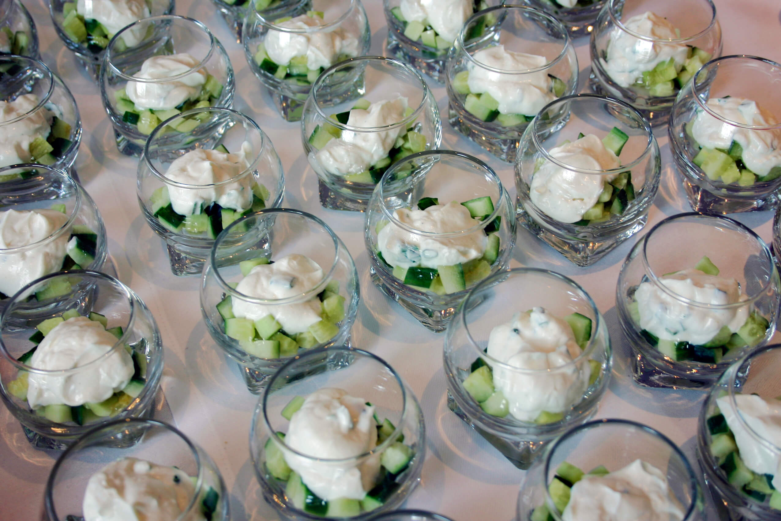 gefüllte Gläschen mit feingeschnittener Gurke, Quark & frischen Kräutern